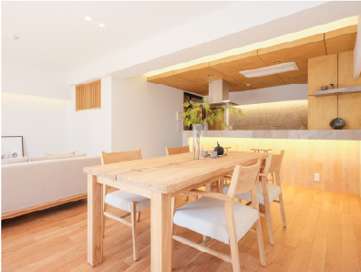 床材には、天然木ならではの木目や表情が美しい突き板フローリングを採用。壁は木材と調和する塗り壁調の白いクロスで、空間に柔らかな印象をプラス。エアコンは木格子のルーバーで目隠しし、空間全体に統一感を持たせています。リビングの掃き出し窓には採光を調整できるバーチカルブラインドを設置し、自然光を効果的に取り込めるよう工夫。さらに、リビングドアをアンバーガラスの開き戸にしたことで、光が玄関にも届きます。